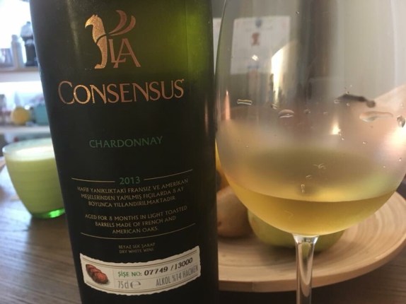 Consensus Chardonnay 2013, Lucien Arkas : This is the first time I drink a bottle of LA winery which is situated near Izmir. Lucien Arkas is a francophone passionate man who makes wine not only from French grapes like this Chardonnay but also from local grapes. Can’t wait to try some other wines as this Chardonnay made a quite good impression. The profound gold colour frightened me a bit but the nose was quite pleasant with notes of yellow apple and pear. The flavours in the mouth are rather rich with yellow apple again, pineapple, apricot and plum. The acidity is medium. The length though is long but there is an after taste of alcohol a bit too present. Quite a nice Chardonnay. Not typical, not among my favourites in Turkey but very decent indeed.